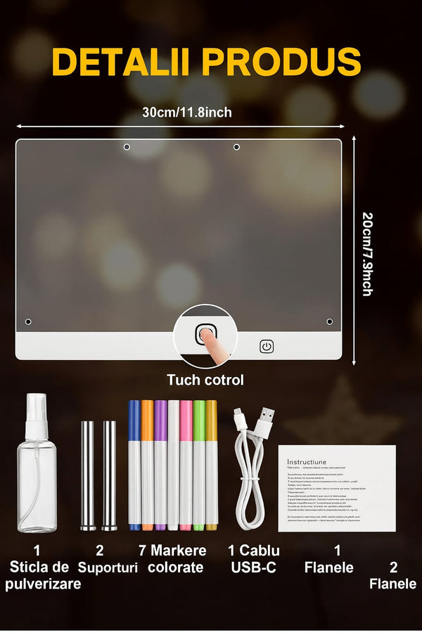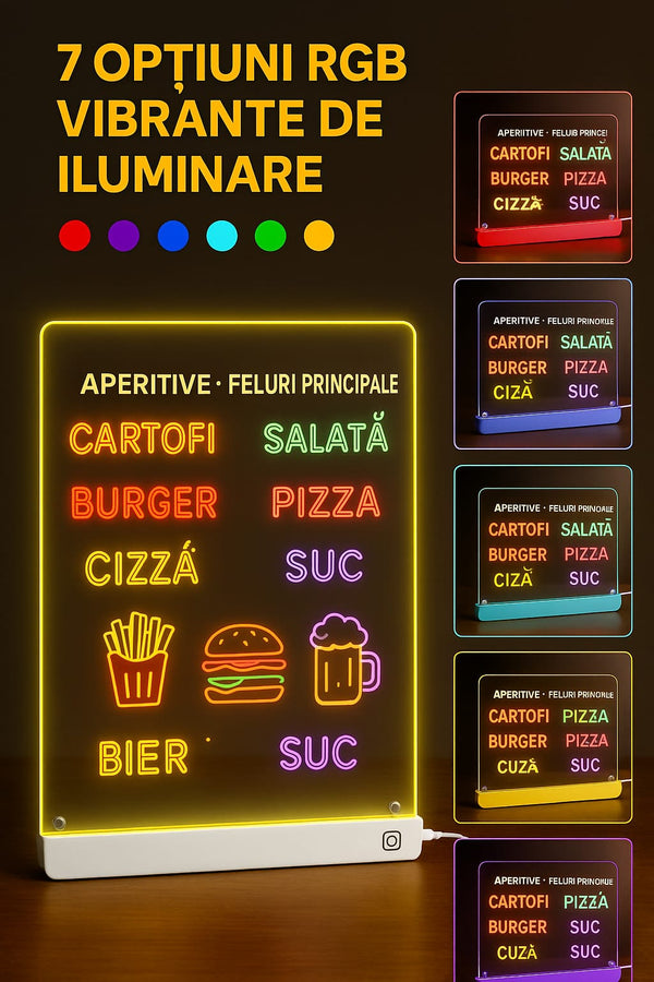 Panoul LED acrilic oferă lumină neon vibrantă. Scrie mesaje care ies în evidență chiar și după apus, perfect pentru reminder acasă sau note pentru familie.